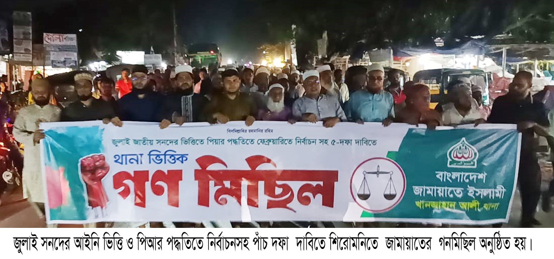 জুলাই সনদের আইনি ভিত্তি ও পিআর পদ্ধতিতে নির্বাচনসহ পাঁচ দফা দাবিতে শিরোমনিতে জামায়াতের গনমিছিল অনুষ্ঠিত মো মামুন মোল্লা খুলনা জেলা প্রতিনিধি জুলাই সনদের আইনি ভিত্তি ও পিআর পদ্ধতিতে জাতীয় সংসদ ...বিস্তারিত পড়ুন