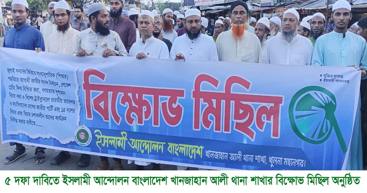 ৫ দফা দাবিতে ইসলামী আন্দোলন বাংলাদেশ খানজাহান আলী থানা শাখার বিক্ষোভ মিছিল অনুষ্ঠিত মোঃ মামুন মোল্লা খুলনা জেলা প্রতিনিধি জুলাই সনদের ভিত্তিতে সংখ্যানুপাতিক (পিআর) পদ্ধতিতে আগামী জাতীয় সংসদ নির্বাচন,লেভেল প্লেয়িং